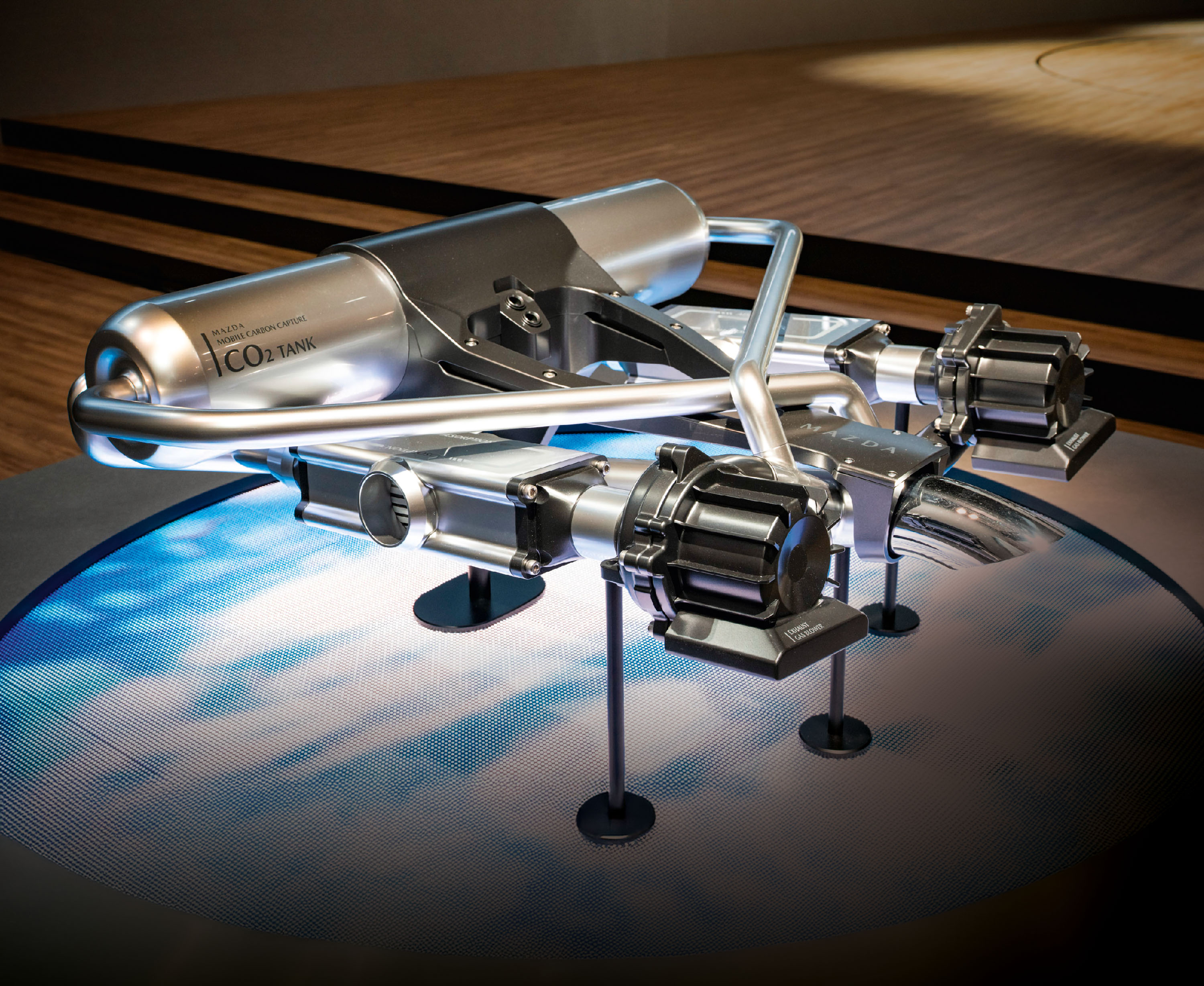 Batizado como Mobile Carbon Capture, o equipamento da Mazda seria conectado tanto ao coletor de admissão quanto ao de escape, capturando o CO2 do ar antes que entre nos cilindros e também resultante da queima do combustível. A fabricante diz que a combinação com o combustível de microalgas faz com que o Vision X-Coupe tenha um resultado carbono negativo de aproximadamente 10%.